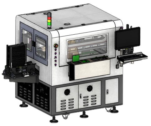 本设备主要用于全自动微震芯片摆料,可对QFN、WB-BGA 、FO-WLP类芯片进行散料视觉分拣,六面检测,装Tray盘叠层出料,机台采用高速直线电机。 产品tray盘堆叠上料,设备自动出tray盘移动到摆料位置,微震盘进行散料,摆料过程中可进行六面检测,实时显示当前产品OK/NG结果,可自动抛除NG料,完成后全OK品出料堆叠盘结果数据可保存,可按客户要求上传mes。